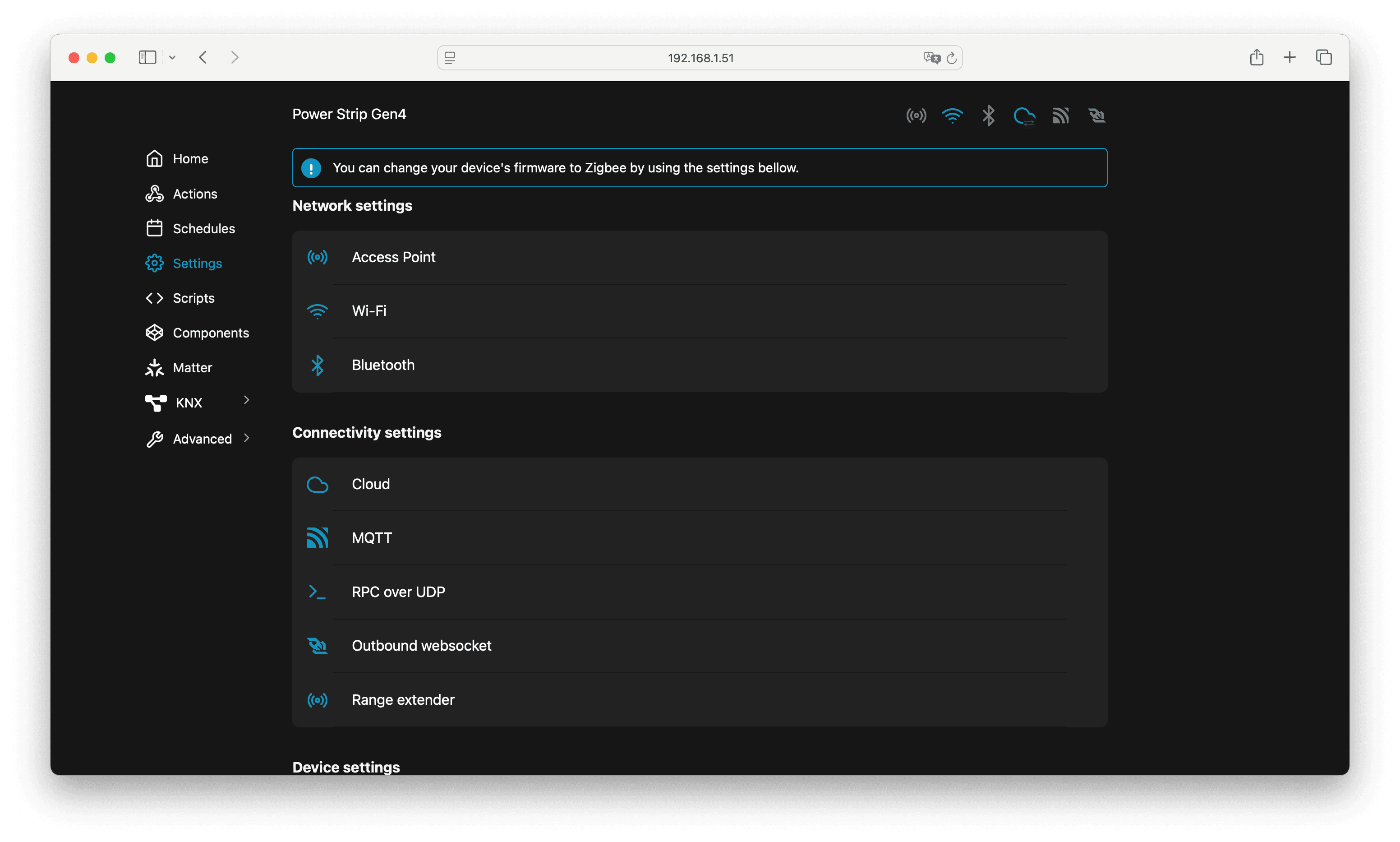 Der Shelly Power Strip 4 Gen4 unterstützt natürlich WLAN, aber auch Bluetooth und sogar Zigbee!