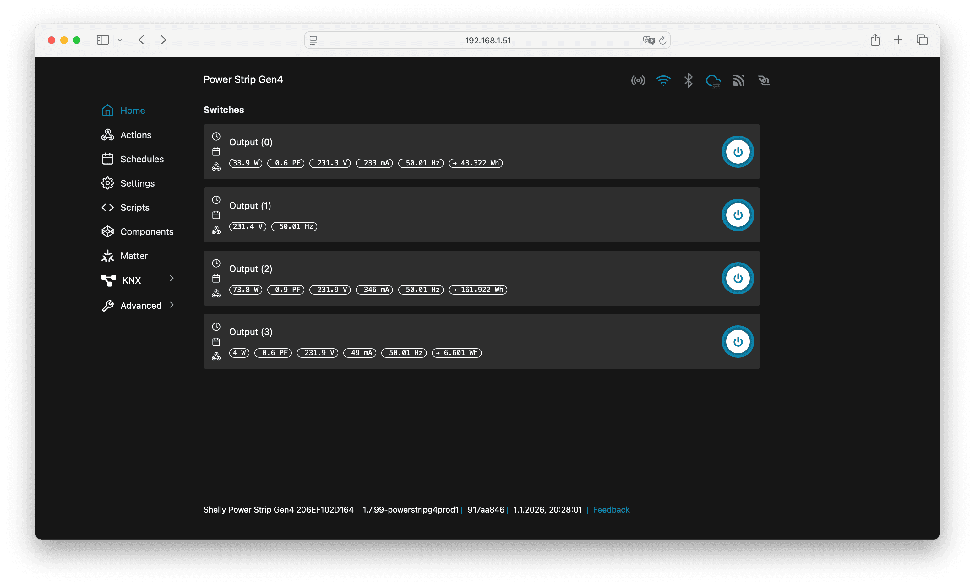 Sowohl in der WebUI wie auch in der Shelly App werden die einzelnen Steckdosen des Power Strip 4 Gen4 mehr oder weniger als individuelle Geräte erkannt und gesteuert.