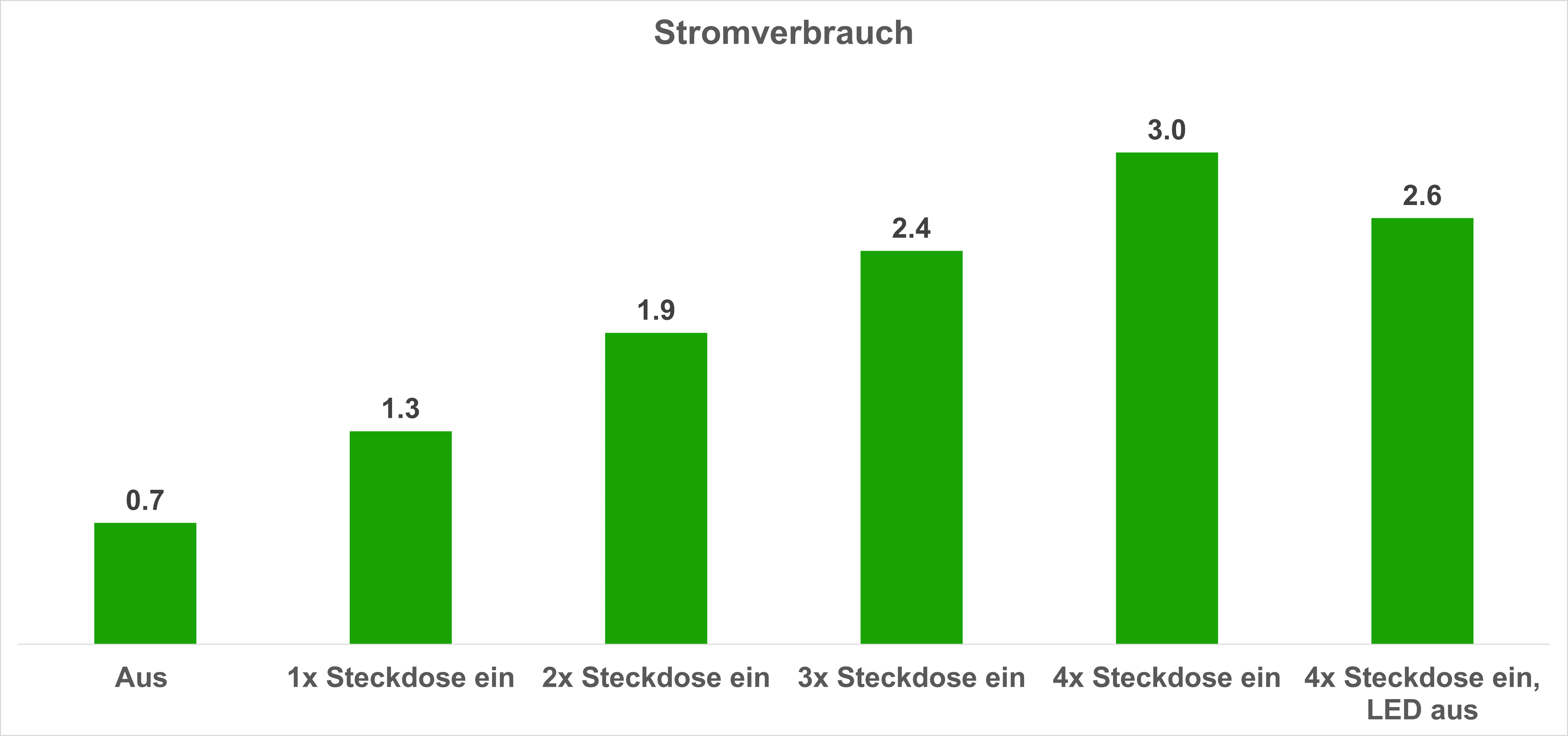 So schwankt der Stromverbrauch zwischen 0,74 W, wenn alle Steckdosen aus sind, und 3 W, wenn alle aktiv sind.