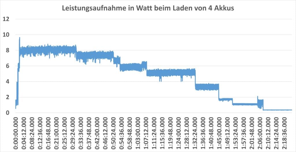 Bei mir im Test dauerte das Laden von 2x AA und 2x AAA Akkus rund 2:10 h.