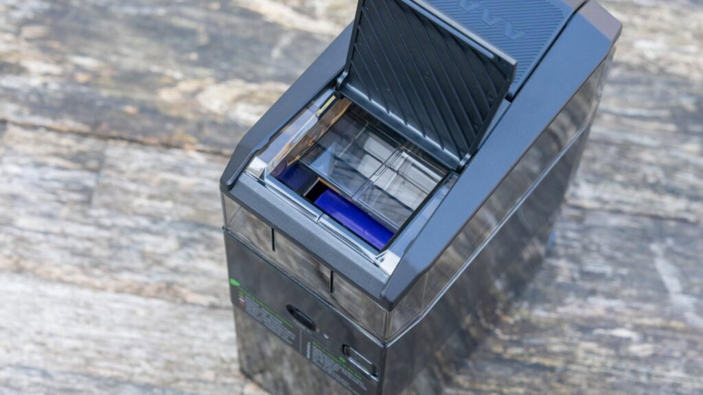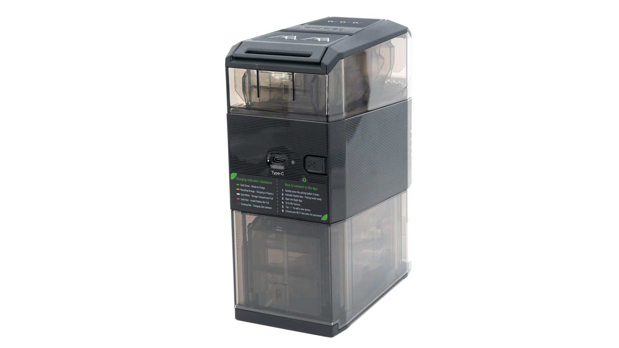 Die Olight Ostation 2 besitzt mehrere Fächer. So hast du auf der Oberseite jeweils ein Fach für AA- und ein Fach für AAA-Akkus.
