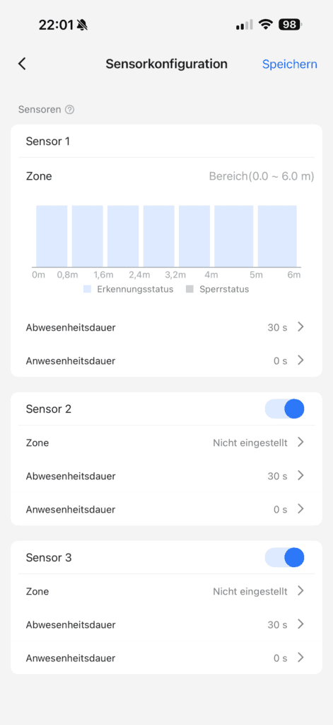 Über die Meross App kannst du bis zu 3 Zonen einrichten mit einer maximalen Reichweite von bis zu 6 Metern, wie auch die Empfindlichkeit des Sensors feinjustieren.