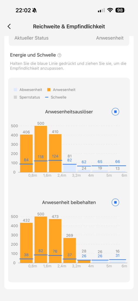Zudem kann ein Radarsensor auch Abstände zur Bewegung messen. So kannst du in der Meross App beispielsweise sehen, auf welcher Distanz +/- die Bewegung erkannt wurde und auch wie stark diese war.