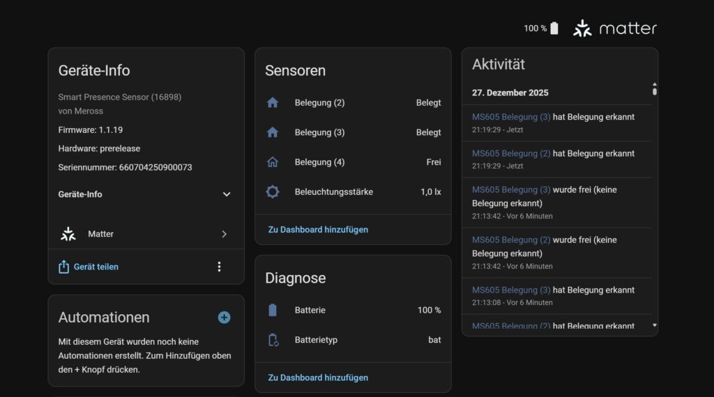 Es ist zwar grundsätzlich möglich, den Smart Presence Sensor einfach direkt in ein Matter-/Thread-fähiges Ökosystem einzubinden, ohne auch nur einmal die Meross App zu installieren, aber das würde ich nicht empfehlen.