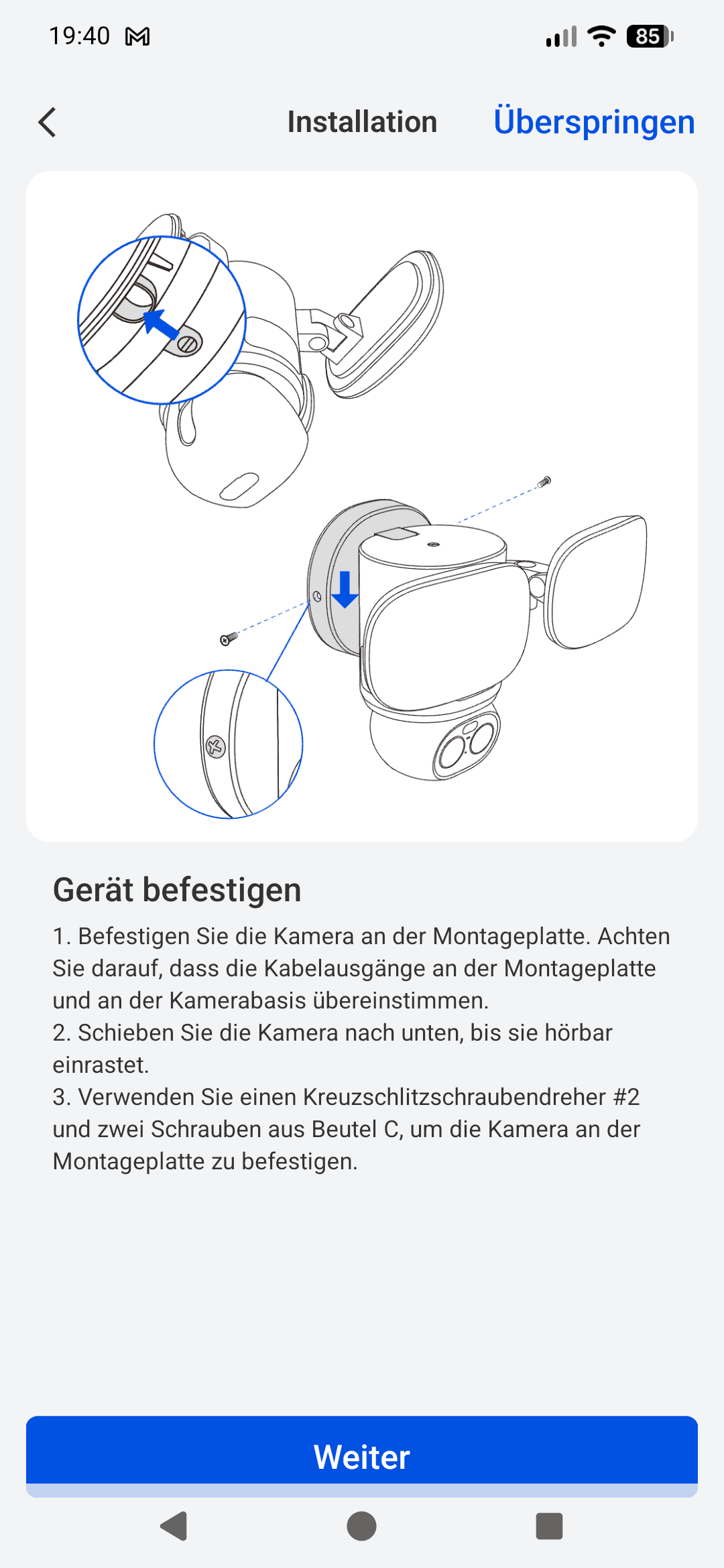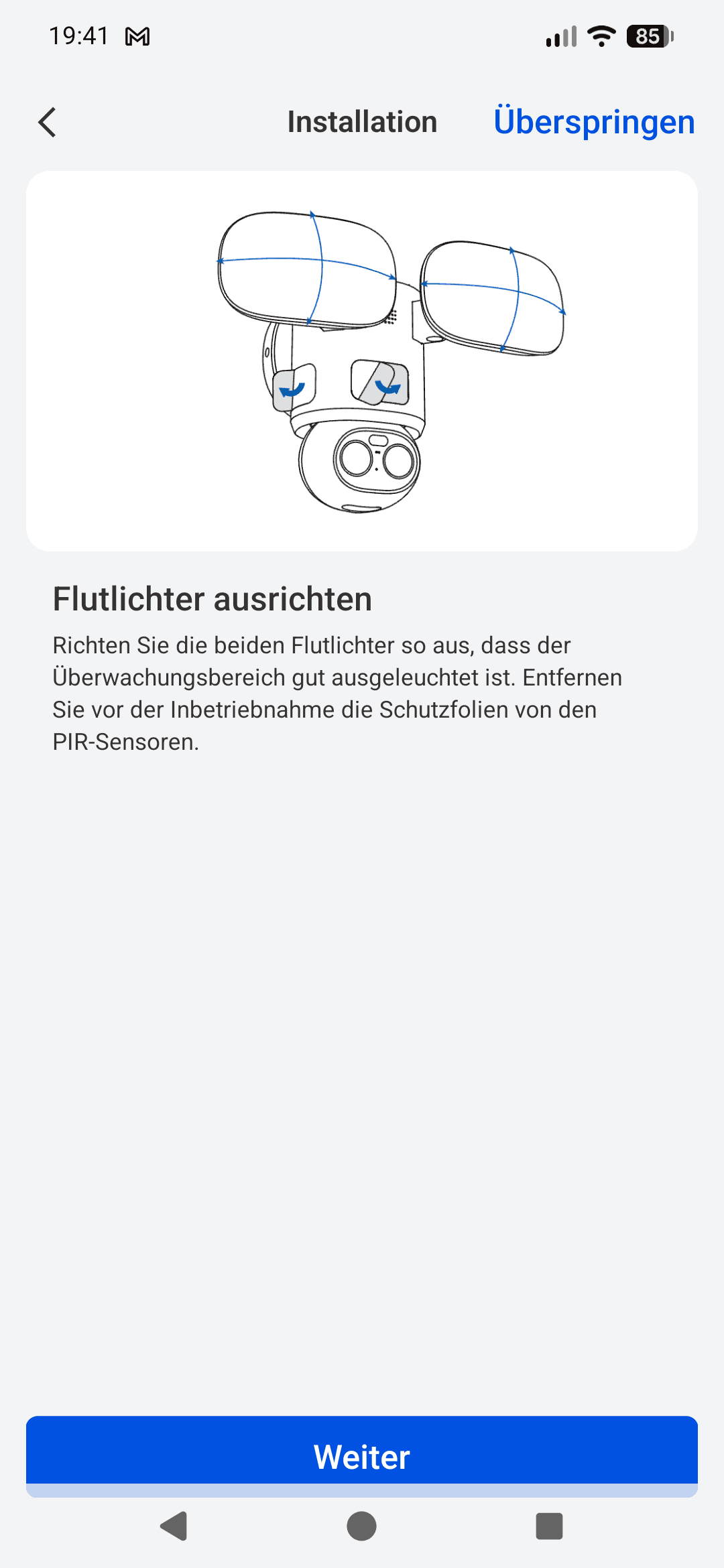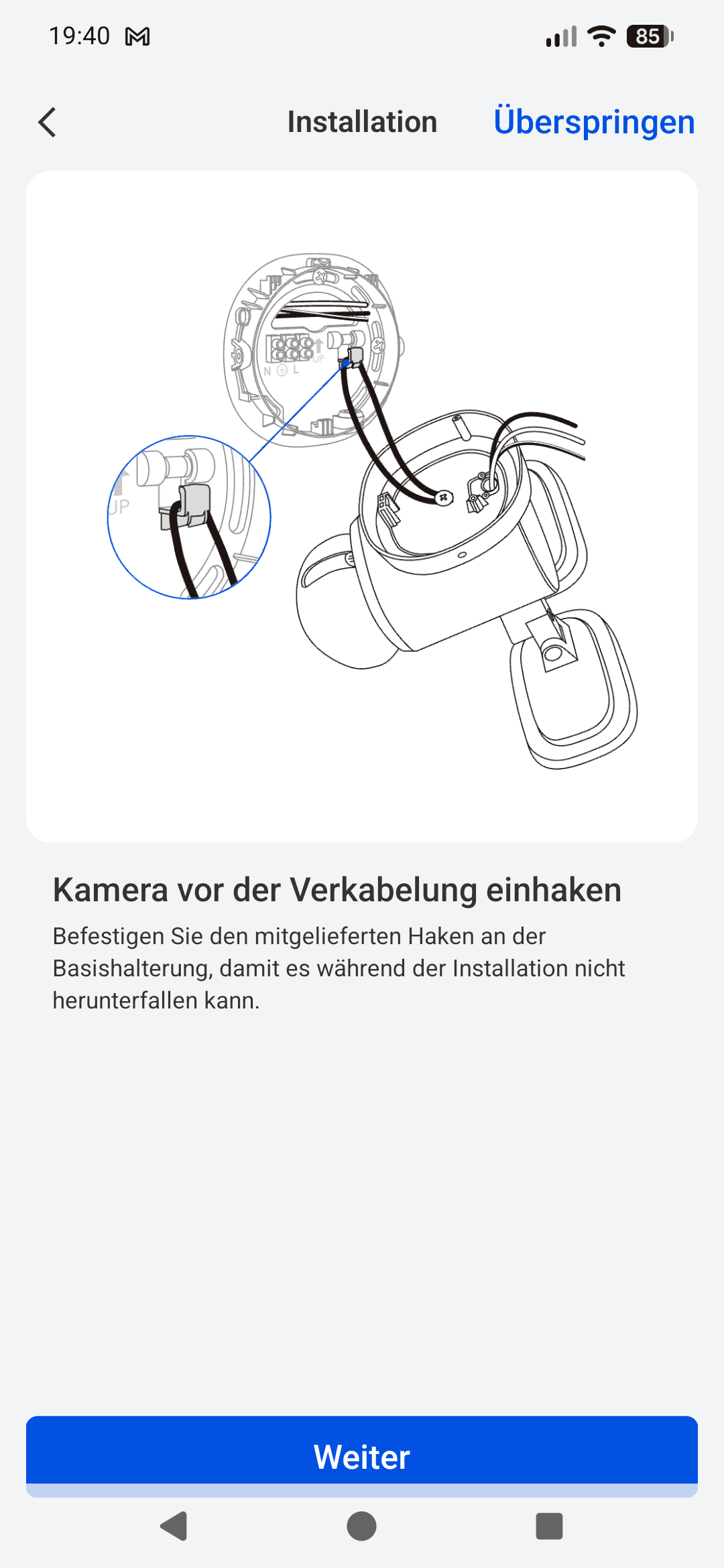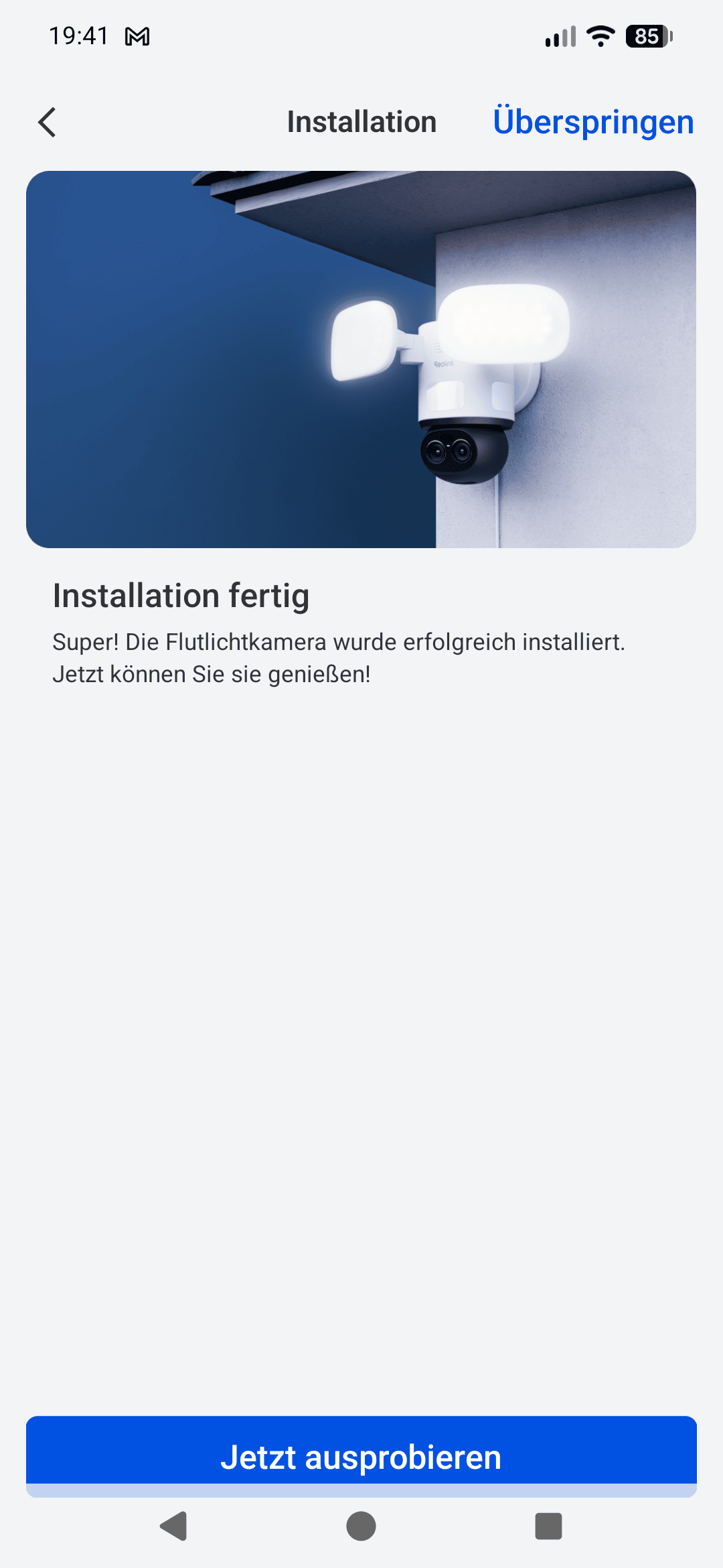 Du kannst die App einfach herunterladen, den QR-Code der Kamera scannen, dann verbindet sich dein Smartphone via Bluetooth mit der Kamera und schließt die Einrichtung sowie die Anbindung an dein WLAN ab.