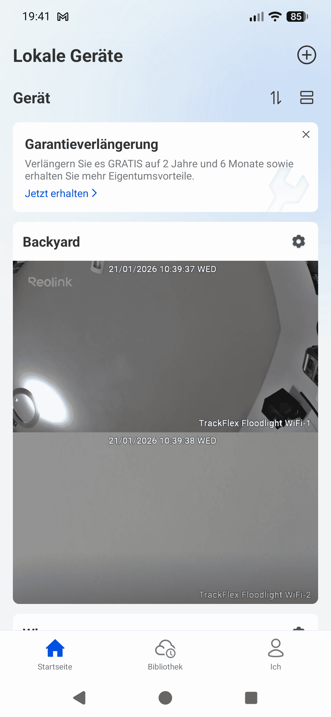 Du findest auf der Startseite eine Übersicht über alle verbundenen Kameras und Geräte. Tippst du in diesem Fall die TrackFlex Floodlight WiFi an, landest du direkt in der Live-Ansicht.