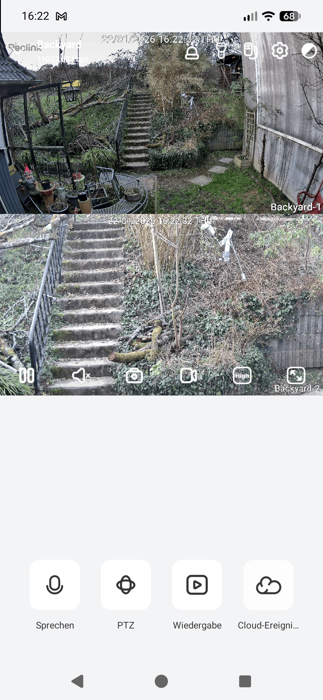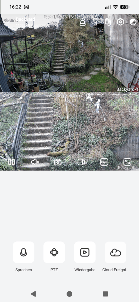 Dort siehst du beide Kamerastreams, kannst manuell Fotos und Videos aufzeichnen, die Zwei-Wege-Kommunikation starten, die Scheinwerfer einschalten und natürlich auch die Kamera drehen und schwenken.