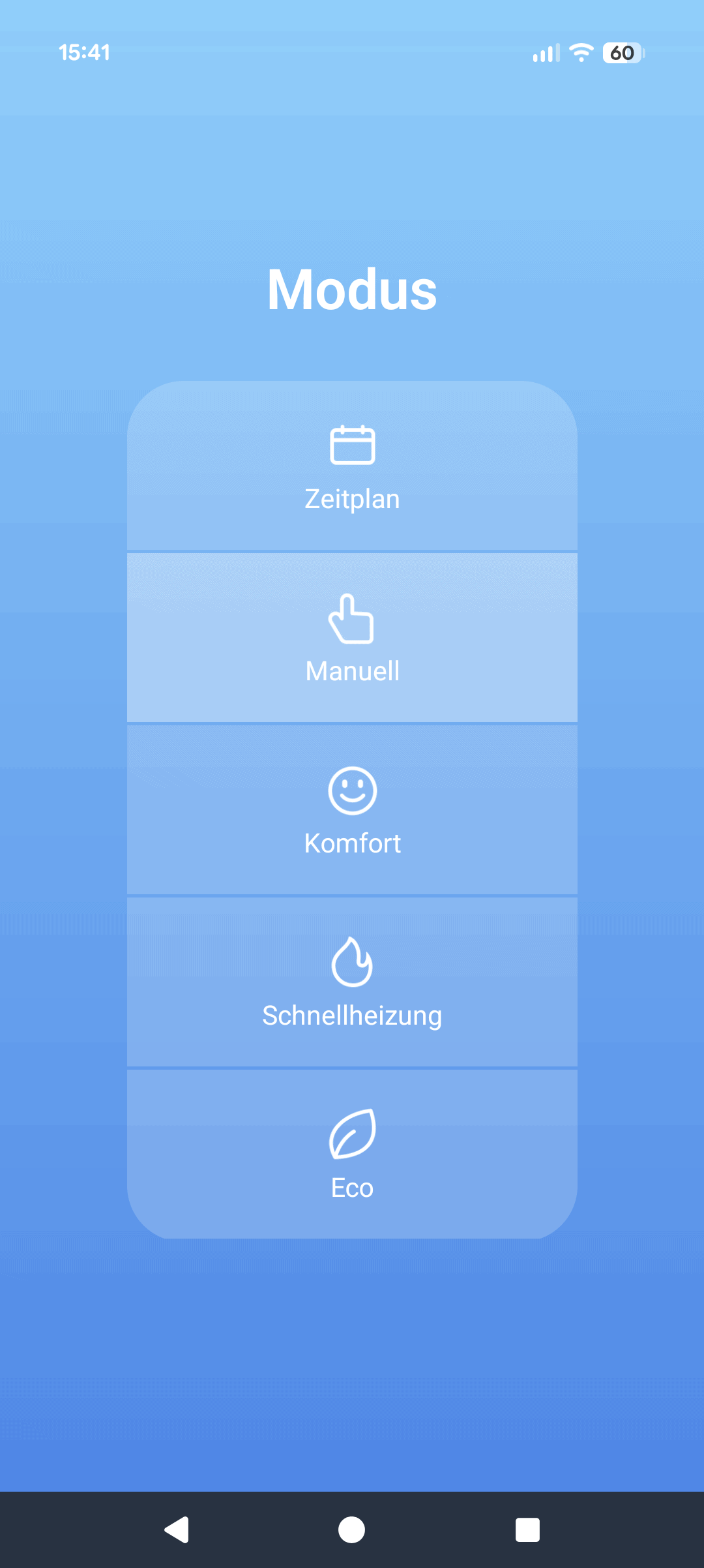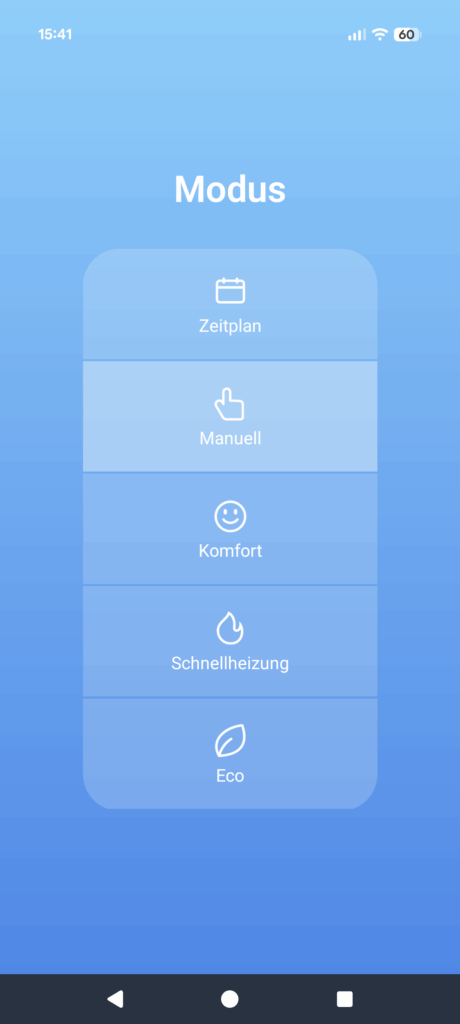 Dies hilft, die Übersicht zu bewahren, gerade wenn du mehrere Thermostate hast. Tippst du die entsprechende Kachel an, landest du in den erweiterten Einstellungen. Hier kannst du das Thermostat manuell steuern, aber auch vor allem einen Zeitplan hinterlegen.