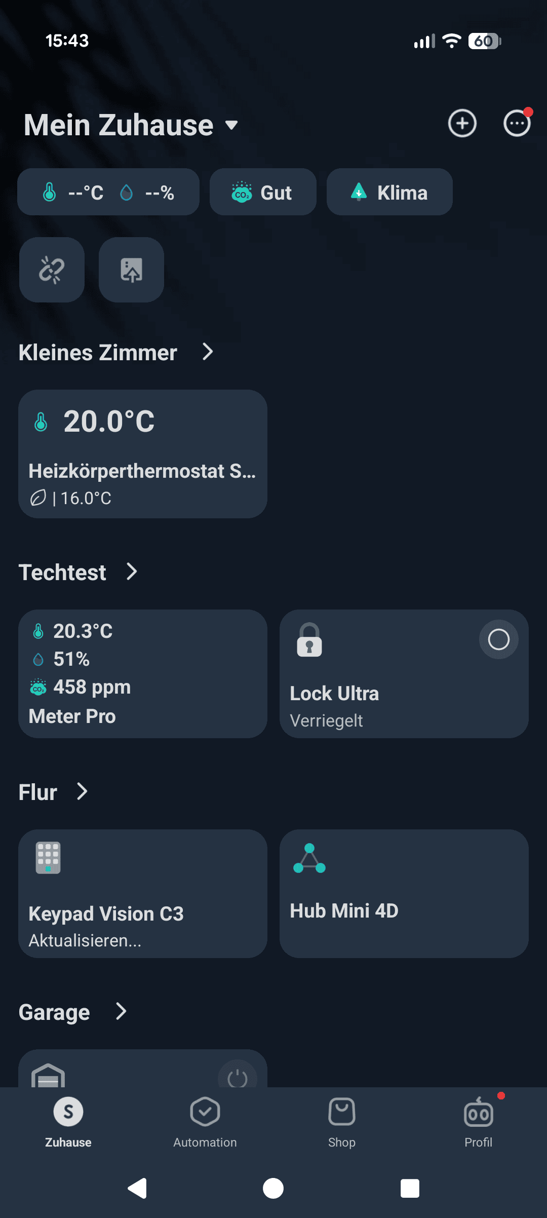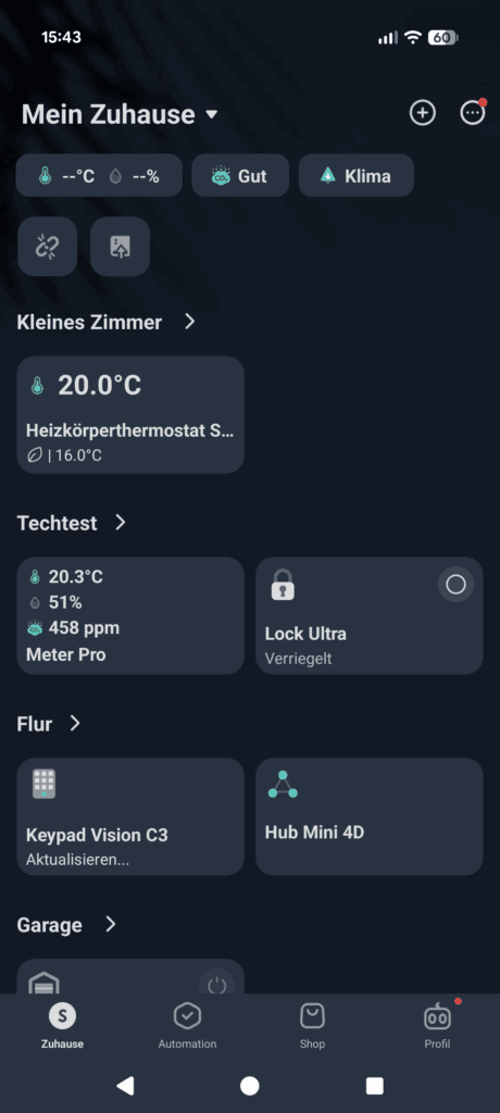 So findest du auf der Startseite eine Übersicht über alle verbundenen Smart-Home-Produkte, wie auch eine kleine „Vorschau“ des Status.