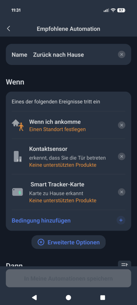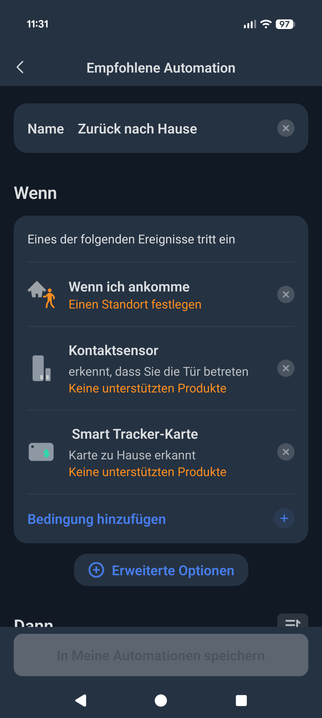 Das Geofencing, also das automatische Ein-/Ausschalten des Thermostats, wenn du gehst oder kommst, läuft über eine Wenn-Dann-Regel, die du anlegen musst.