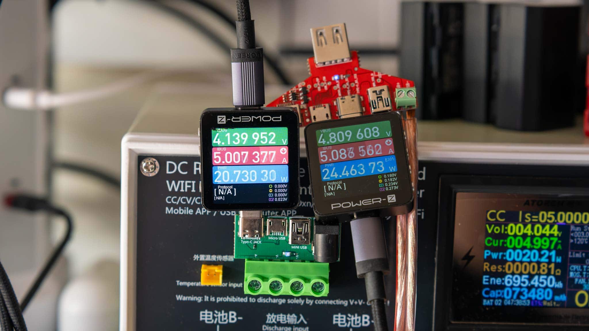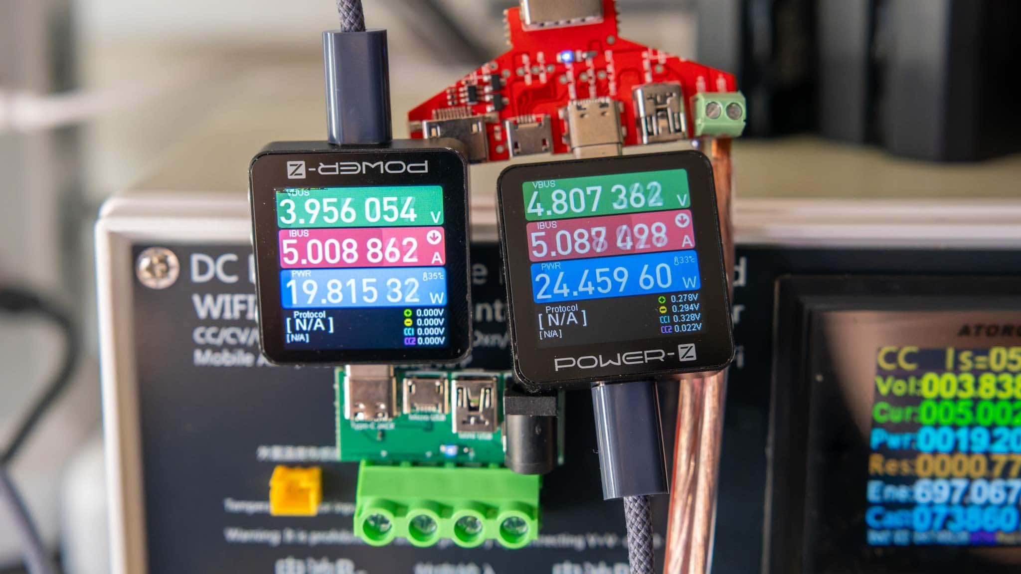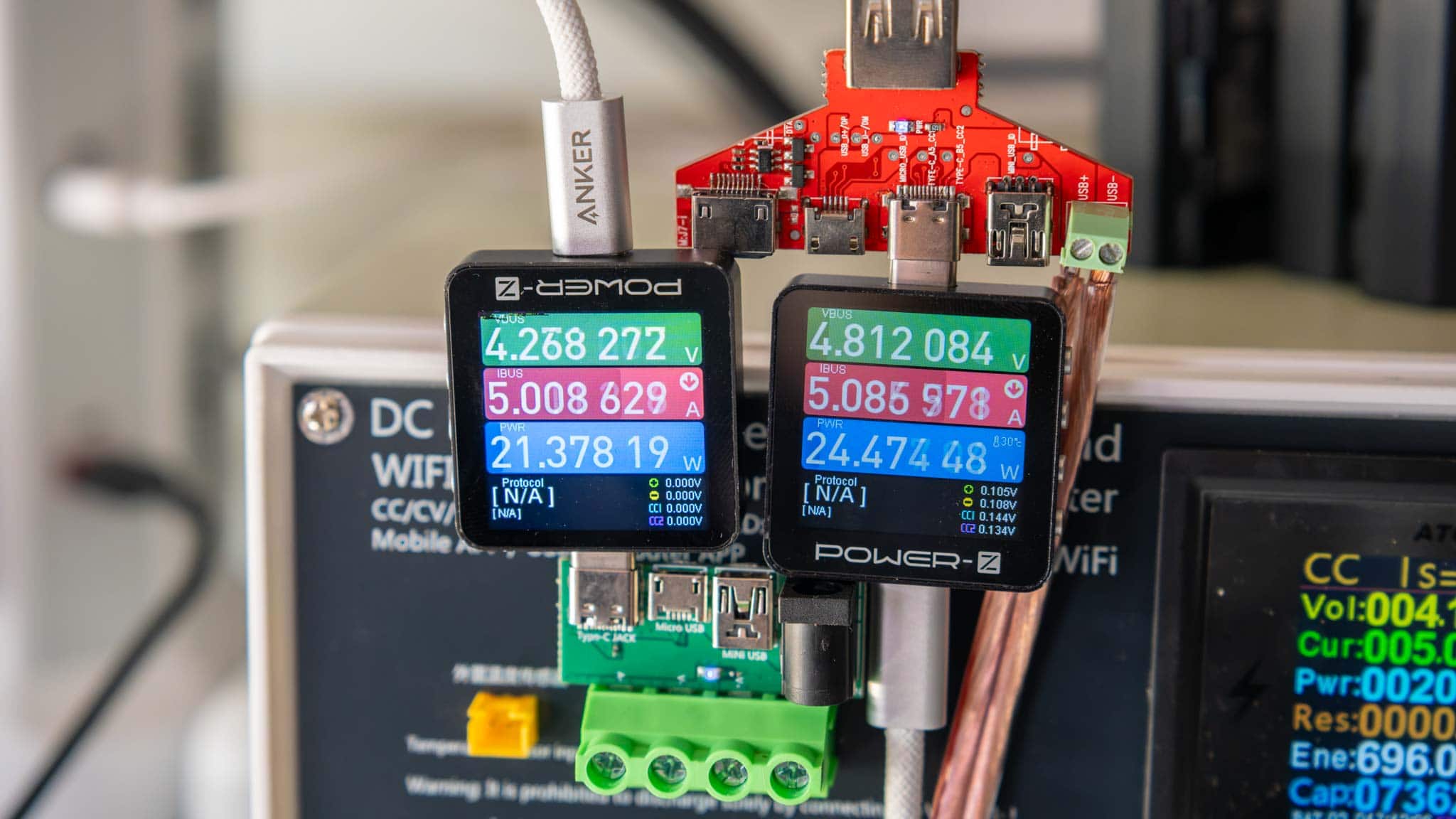Dafür habe ich alle Kabel an ein Labornetzgerät und eine elektronische Last angeschlossen und gemessen, wie hoch der Spannungsabfall bei 5 V und bis zu 5 A ist. Niedrigerer Spannungsabfall = weniger Widerstand = theoretisch eine leicht höhere Ladegeschwindigkeit.