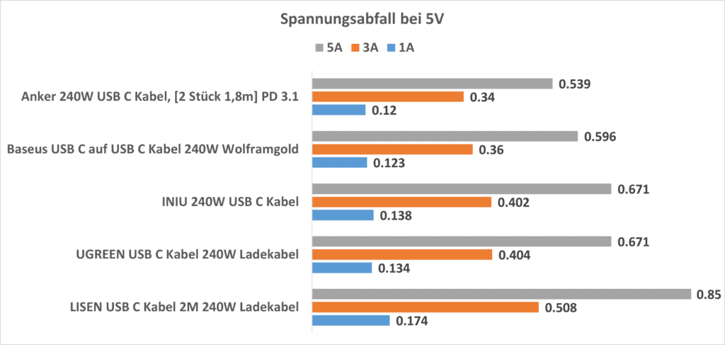 Interessanterweise bietet das Anker-Kabel den geringsten Spannungsabfall und somit die beste elektrische Qualität. Auf Platz 2 haben wir das Baseus-Ladekabel. INIU und UGREEN sind praktisch gleichauf auf Platz 3 und 4. Das Kabel mit dem größten Widerstand ist das günstigste Kabel im Vergleich, das Modell von LISEN.