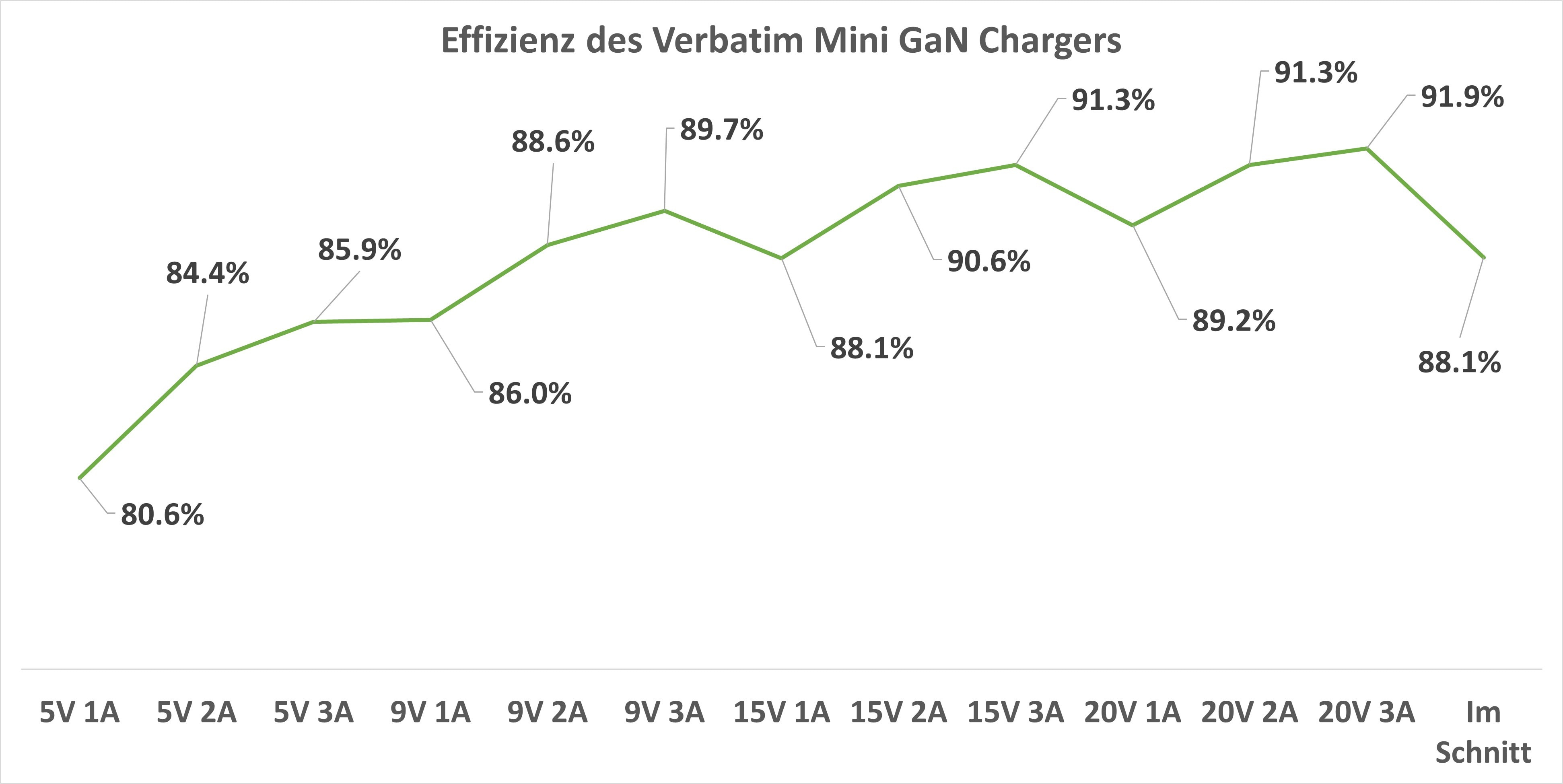 Im Schnitt erreichte dieses eine Effizienz von 88,1 %. Das ist auch verglichen mit anderen Ladegeräten ein starkes Abschneiden.