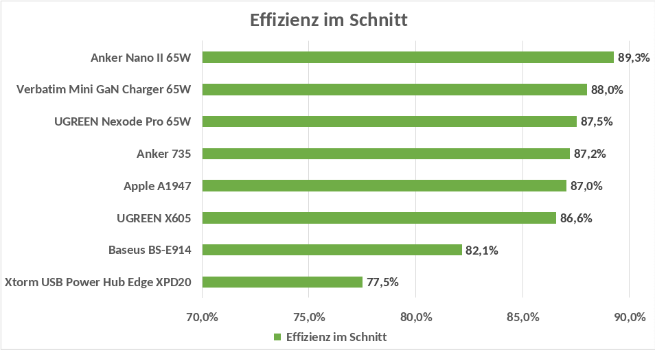 Diese schwankte zwischen 80,6 % und 91,9 %. Das ist ein sehr gutes Abschneiden für ein 65-W-Ladegerät!
