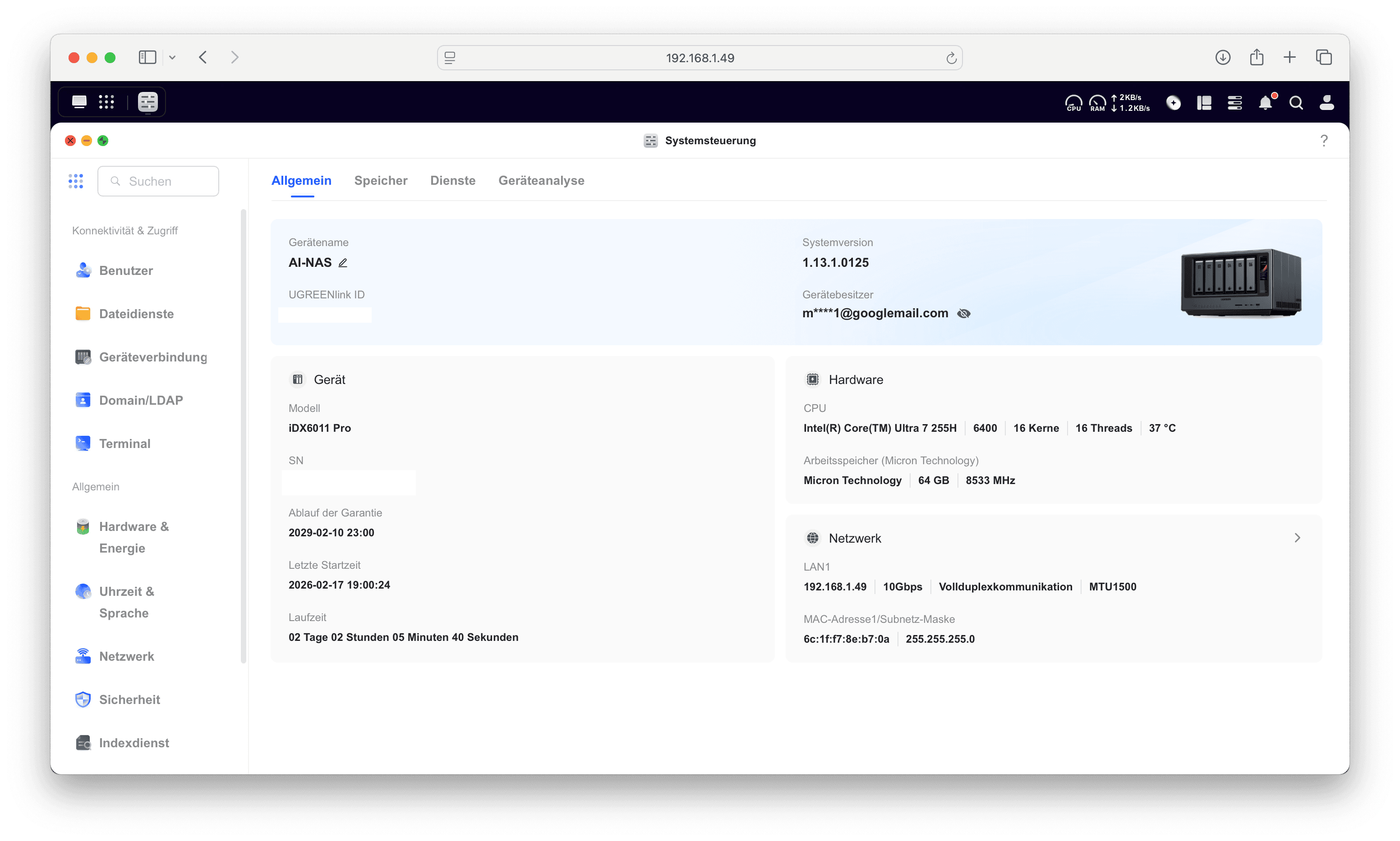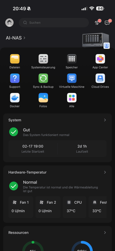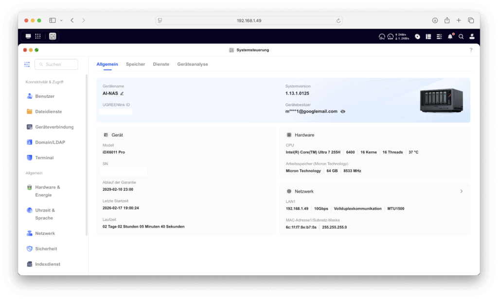 Abseits der ganzen KI-Features und der extremen Hardware überzeugt das UGREEN NASync iDX6011 Pro auch ganz klassisch als NAS auf ganzer Linie. Die grundlegenden Funktionen wie Dateiablage, Backups, Medienverwaltung, Fotoverwaltung, Docker-Support, virtuelle Maschinen und Netzwerkdienste sind stabil, schnell und benutzerfreundlich umgesetzt. Besonders die moderne WebUI, die starke Smartphone-Integration und die sehr gute Performance über die 10-Gbit-Anschlüsse erfreuen. Auch ohne KI-Features bekommst du hier ein sehr leistungsfähiges, schnelles und rundes NAS-Gesamtpaket, das sich problemlos mit etablierten Herstellern messen kann.