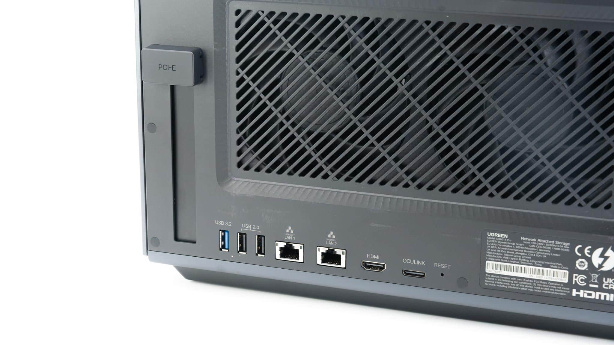 Das ist eine hervorragende Ausstattung! Zunächst wichtig für die NAS-Funktion sind die beiden 10-Gbit-LAN-Ports. Zudem haben wir 2× Thunderbolt und einen OCULINK-Port. Letzterer erlaubt beispielsweise das Anschließen einer externen GPU. Abgerundet wird das Ganze durch ein paar USB-A-Anschlüsse.