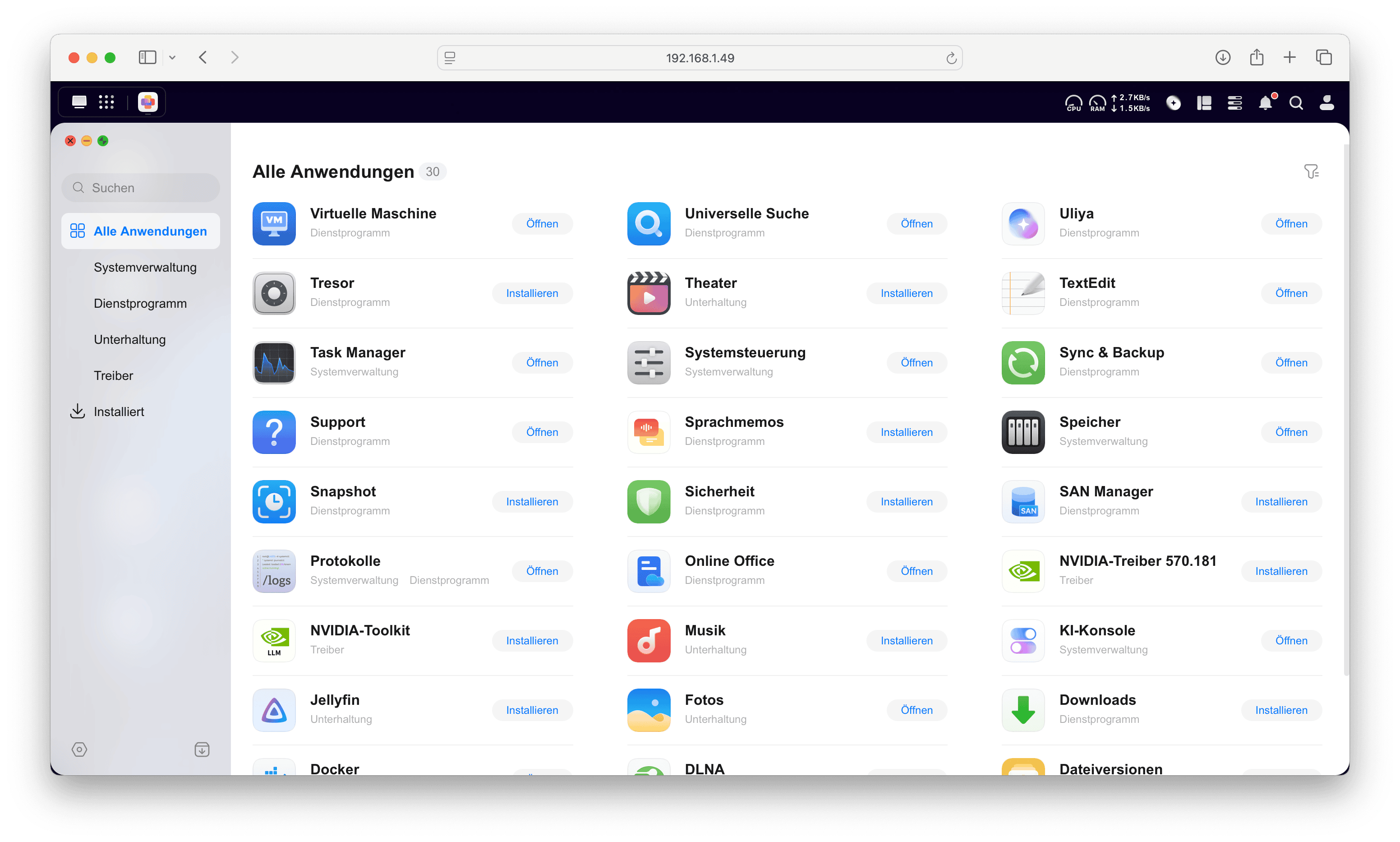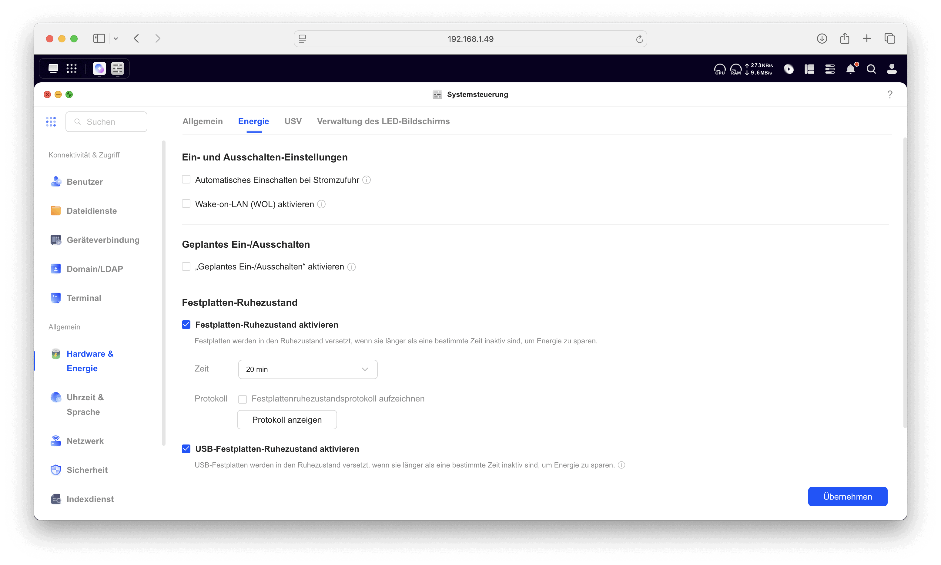 In der Systemsteuerung können Benutzerkonten erstellt, Netzwerkeinstellungen vorgenommen oder allgemeine Energieoptionen angepasst werden. Alle Einstellungen erfolgen über eine grafische Oberfläche mit Icons und Menüs. Insgesamt ist die Benutzeroberfläche intuitiver als bei Lösungen wie Unraid oder TrueNAS, und in den letzten Updates hat diese doch einen guten Feinschliff erhalten.