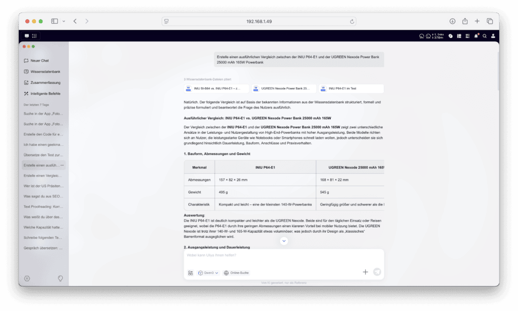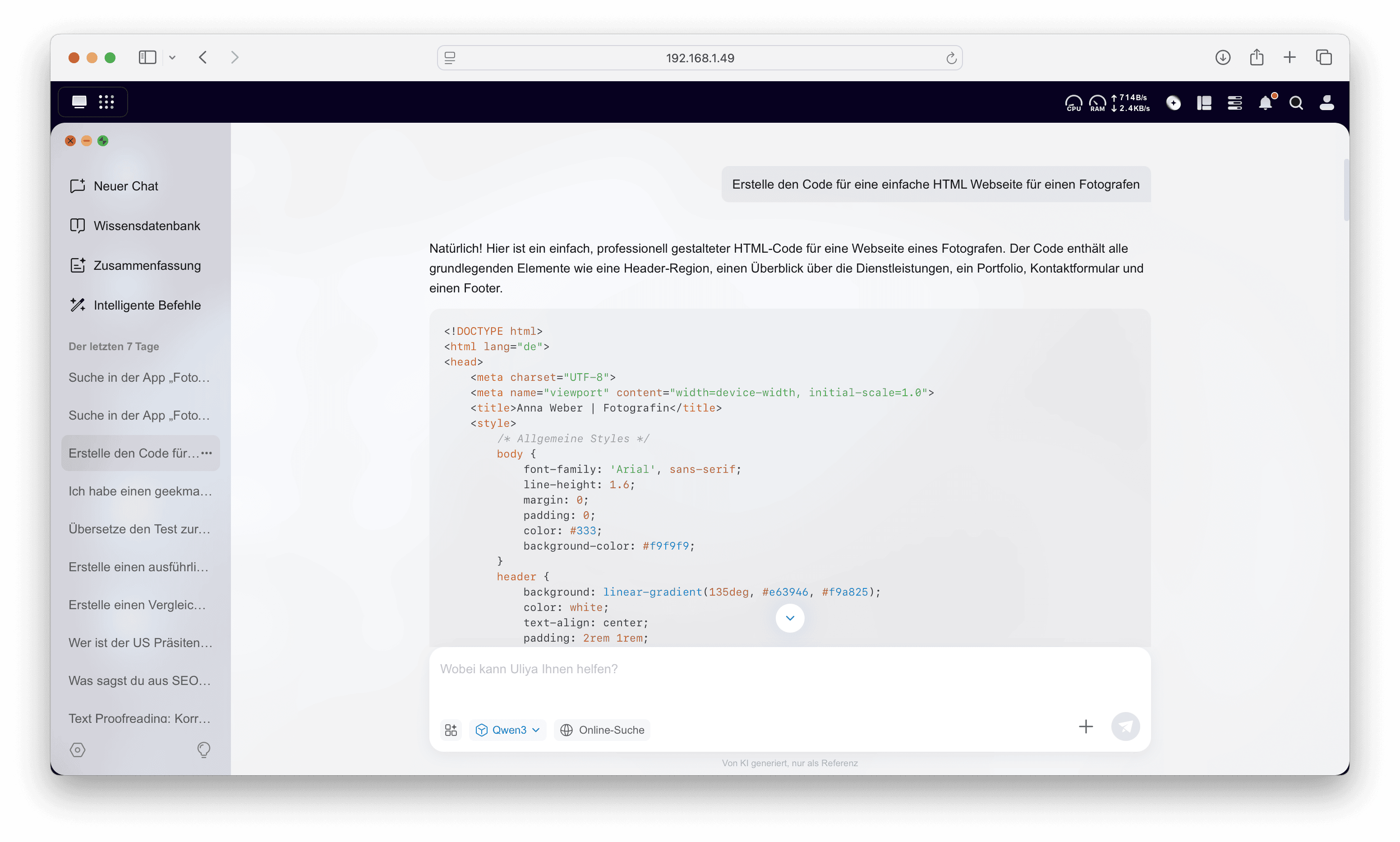 Dennoch liegt die Stärke von Uliya mit Qwen3 primär bei klaren und einfachen Anweisungen, wo nicht zu viel um die Ecke gedacht werden muss. Bei solchen Anwendungen, wo das nötig ist, musst du zu Cloud-Modellen aller ChatGPT, Gemini usw. greifen.