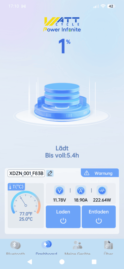 Hier kommt nun das Bluetooth-BMS ins Spiel. Dieses kann dir zuverlässig Auskunft unter anderem über den aktuellen Ladestand geben. Hierfür benötigst du die entsprechende App, bei WattCycle ist es die WattCycle-App, wer hätte es gedacht.