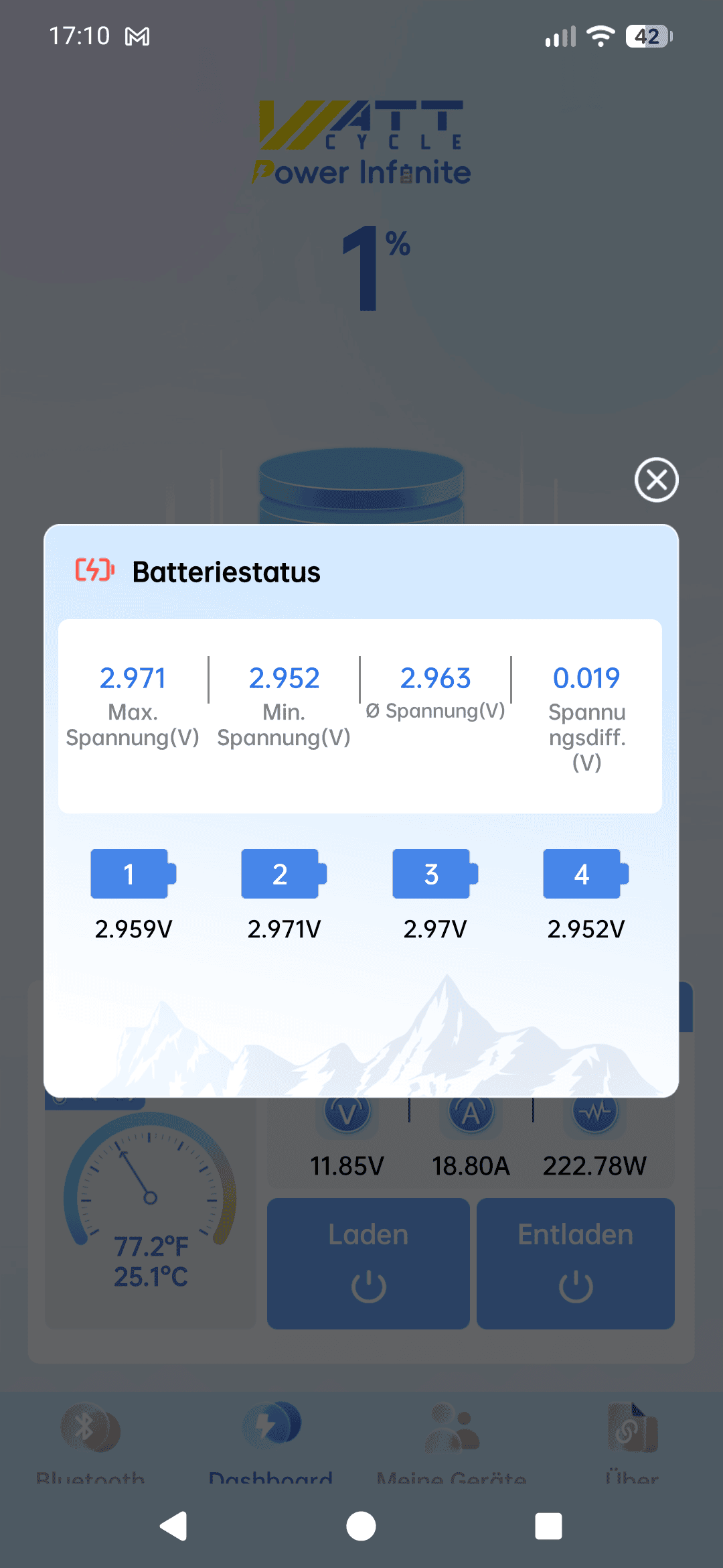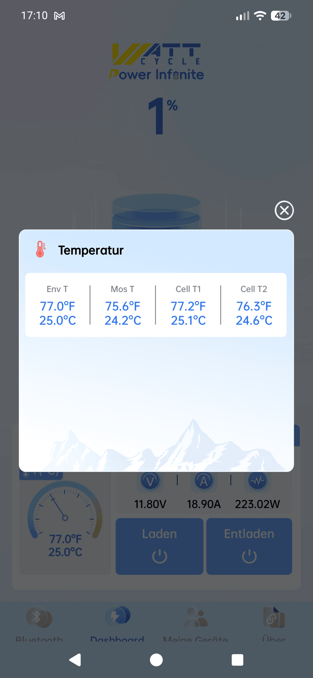 Hier kommt nun das Bluetooth-BMS ins Spiel. Dieses kann dir zuverlässig Auskunft unter anderem über den aktuellen Ladestand geben. Hierfür benötigst du die entsprechende App, bei WattCycle ist es die WattCycle-App, wer hätte es gedacht.
