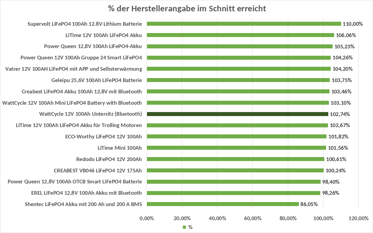Im Test schwankte die Kapazität zwischen 102,259 Ah bzw. 1304 Wh und 103,78 Ah bzw. 1310 Wh.