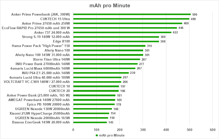 - Anker Prime Powerbank (26K, 300 W) – 506 mAh im Schnitt pro Minute