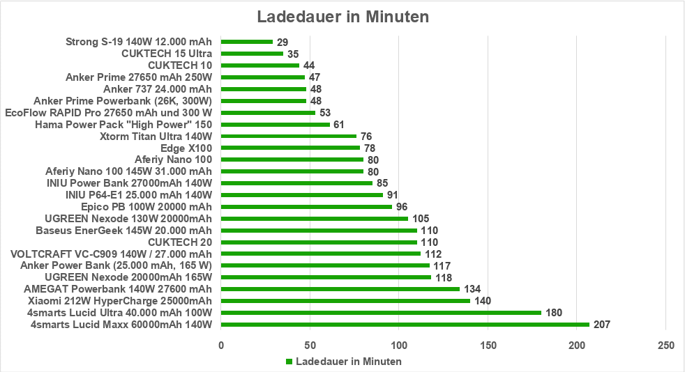 Dies sind auch alle Powerbanks, die sich in unter einer Stunde komplett laden ließen. Abseits von der Strong S-19, welche in gerade einmal 29 Minuten geladen ist, wird die Top 5 auffällig von Anker und CUKTECH dominiert.