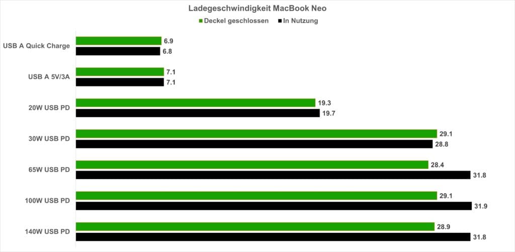 Im Test konnte das MacBook Neo maximal 30–32 Watt aufnehmen, egal ob im Leerlauf oder unter Last. Das ist der Deckel, mehr zieht es schlicht nicht. Im Standby (Notebook zugeklappt) liegt die Aufnahme sogar etwas darunter, bei rund 28–30 Watt.
