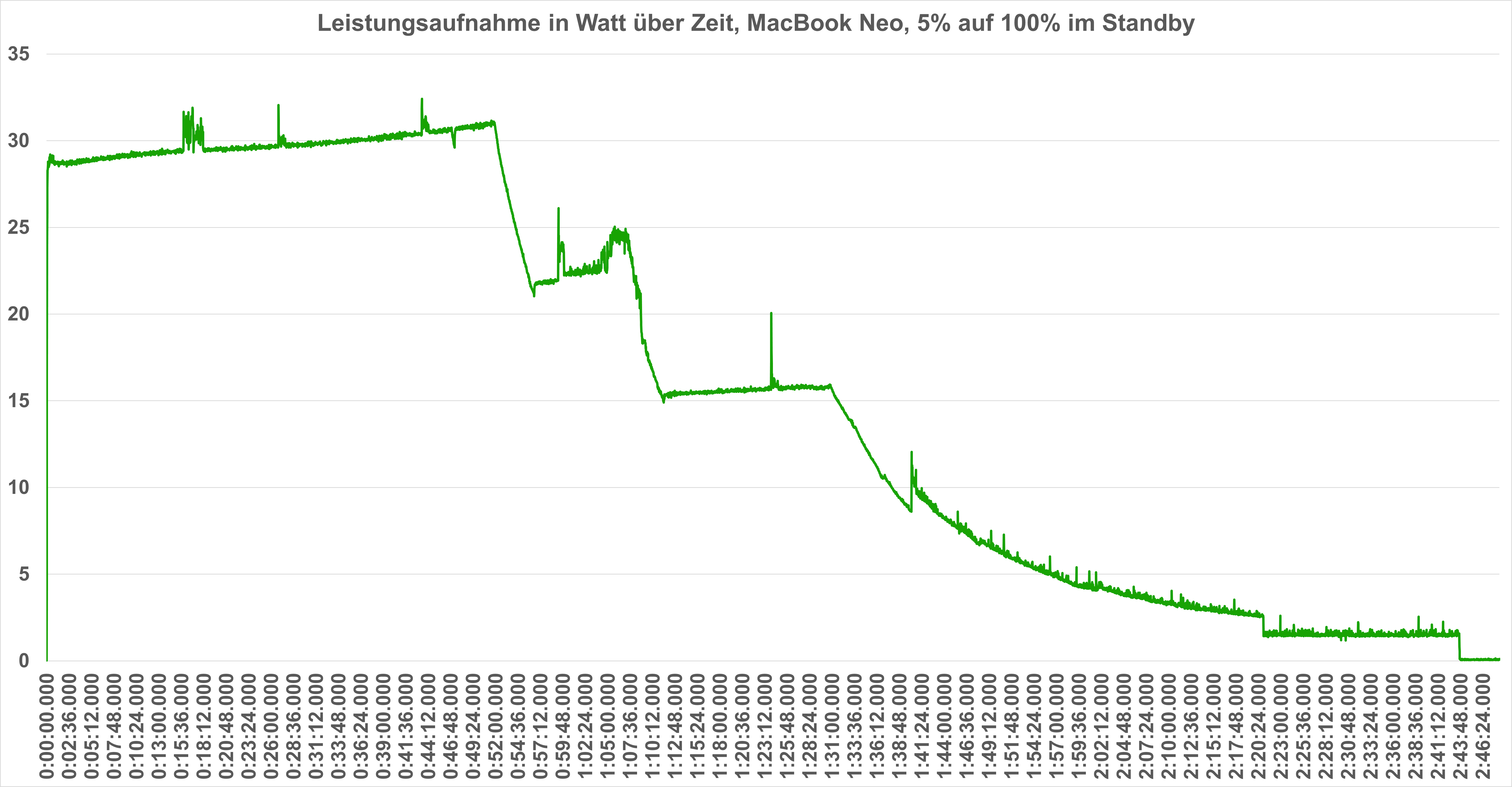 Aber wie lange dauert eine vollständige Ladung des MacBook Neo? Für diesen Test habe ich das Notebook auf 5 % entladen und dann im Standby (zugeklappt) geladen und dabei die Leistungsaufnahme mitgeloggt.